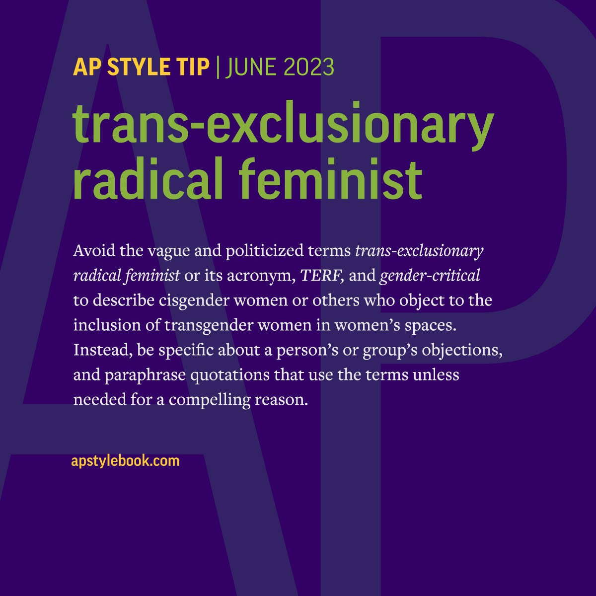 However, it is important to note that conservatives in the media do not bear all the blame. Traditional media outlets in the United States have also fanned the flames of this hatred by fundamentally refusing to simply speak to the facts. Insisting on reporting on “both sides” of the “controversy” and instead of merely reporting actual facts, reporters and media outlets across the spectrum have misled the American public about the realities of gender-affirming care, child sexual abuse, and more. To this end, The Associate Press in June revised its style guidelines, further blurring reality by preventing journalists from even calling a spade a spade: terms such as “trans-exclusionary radical feminist” and “gender-critical” were too political for reporters to use. Instead, the Associated Press argued, journalists should outline opponents of transgender rights’ specific arguments instead of using these terms – even though these terms were invented and popularized by these opponents to describe themselves in the first place. To quote one Twitter user, the AP, “recommends reporters not discuss fascists without uncritically repeating their propaganda” (215).