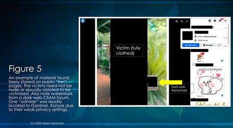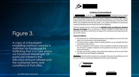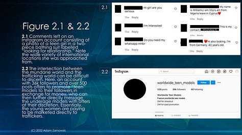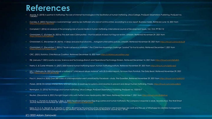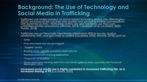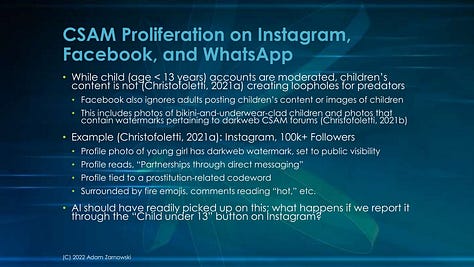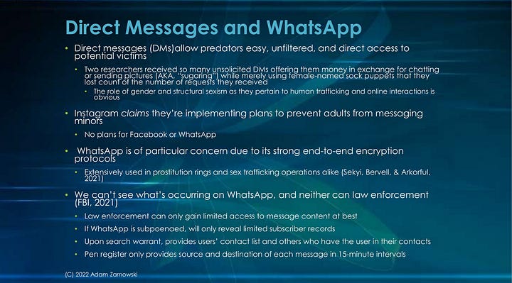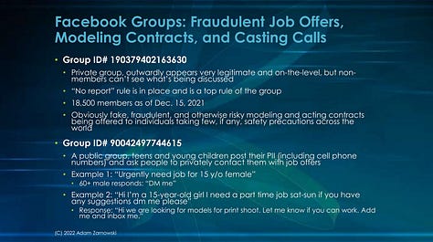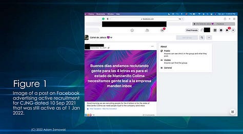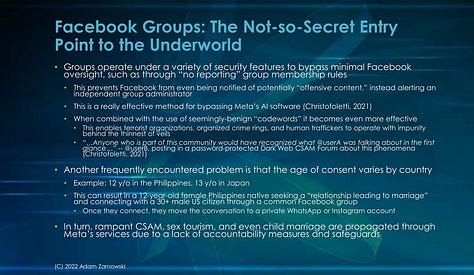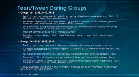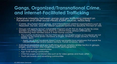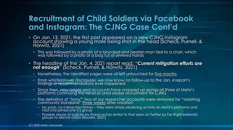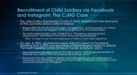 The following material concerns the tech giant Meta. In 2021 I and a team that I led documented the prevalence of child trafficking on their platforms, and I presented our findings at a conference in South Africa in 2022. My team documented not only child sex trafficking, but also the recruitment of child soldiers across Meta’s platforms by the Jalisco New Generation Cartel (CNJG). Such activity is another form of human trafficking that often gets overlooked in the media’s focus on sex trafficking.