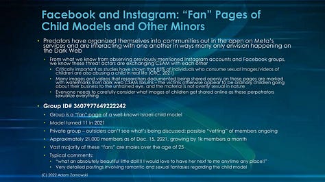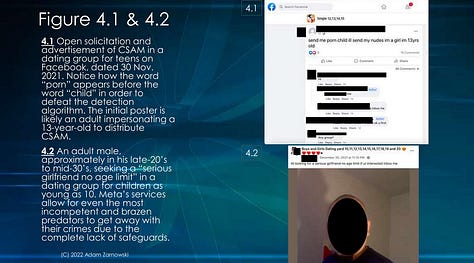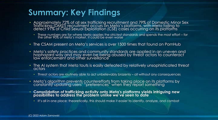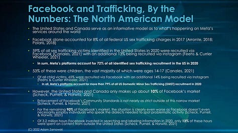 Before we continue much further, I want to strongly encourage those reading this to read through the aforementioned PowerPoint presentation (apparently what the kids now call a “slide deck”) that I have converted to PNG format and included below. This will help you to understand the true scope of what Meta has willingly allowed to take place on their platforms and to understand the necessary context of what we’ll be discussing here — and how Meta generated literally billions of dollars in profit by allowing it to continue.