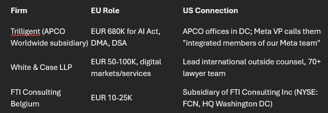 I cross-referenced Meta's 18 EU retained lobbying firms against US lobbying registrations.