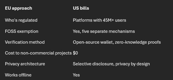 The US bills assume every operating system is built by a corporation with the infrastructure and revenue to absorb these costs. The EU started from the opposite assumption and built accordingly.