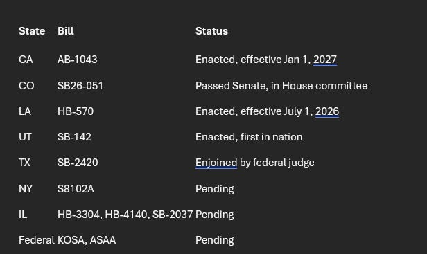 Colorado SB26-051 (passed the Senate 28-7, now in the House) copies the same definitions in the same order, same penalty structure ($2,500 per child for negligent violations, $7,500 for intentional ones), same exemptions. The template is the ICMEC “Digital Age Assurance Act,” and it’s been introduced or is pending in Illinois (three separate bills), New York, Kansas, South Carolina, Ohio, Georgia, Florida, and at the federal level.