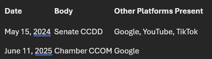 Five public hearings across the Senate and Chamber. **Tais Niffinegger**, Meta's "Manager of Public Policy for Safety and Well-being," appeared at two: