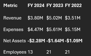 Negative net assets every year, getting worse. Revenue down 24% year over year. Headcount dropped from 21 to 13.
