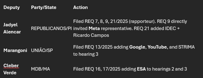 The Chamber hearing where Meta appeared was framed as "digital education, parental controls and inclusion." Softest framing of the five. The bill's rapporteur, **Dep. Jadyel Alencar**, personally invited Niffinegger (REQ 9/2025). Deputies Marangoni and Cleber Verde filed requests to add Google and the Entertainment Software Association; their justification language mirrors industry talking points.