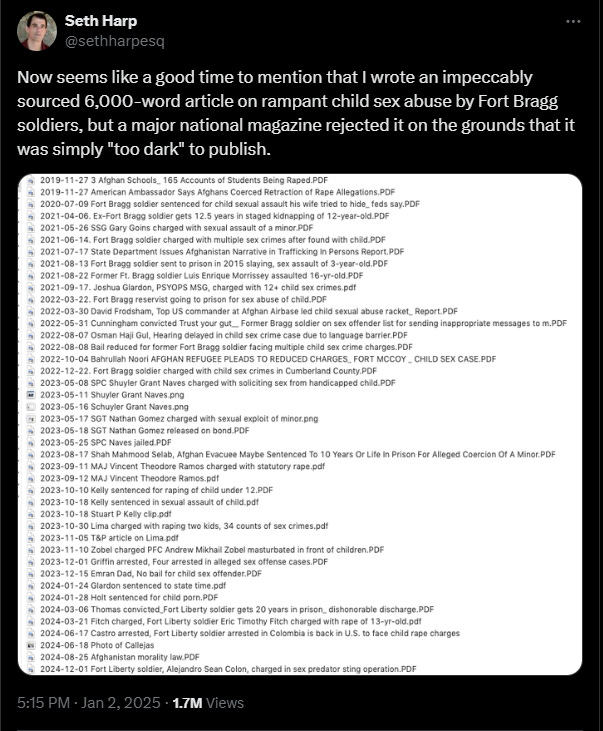 I stumbled upon Harp’s work while researching Ft. Bragg for my own book, Jörmungandr. To be more precise, I was investigating the horrific sexual assault problem that exists at Ft. Bragg, which seems to very strongly correlate with extensive crimes against children and CSAM (child sexual abuse material) offenses originating at the North Carolina base.