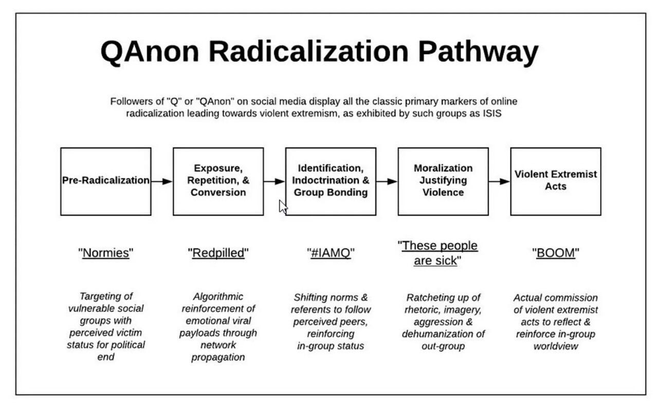 The connection to Harp’s work is bolded. As I discussed in Chapter 10, humans suffer from a number of means that allow them to engage in moral disengagement, allowing them to participate in atrocity crimes and justify the otherwise unjustifiable. As the previous images show, QAnon contains these elements quite explicitly. It turns out that a central figure in the QAnon mythos, Lt. Gen. (Ret.) Michael Flynn, called Ft. Bragg home, having even described in one of his books (which I will not link) the aforementioned radicalization process “how to make people kill people.”